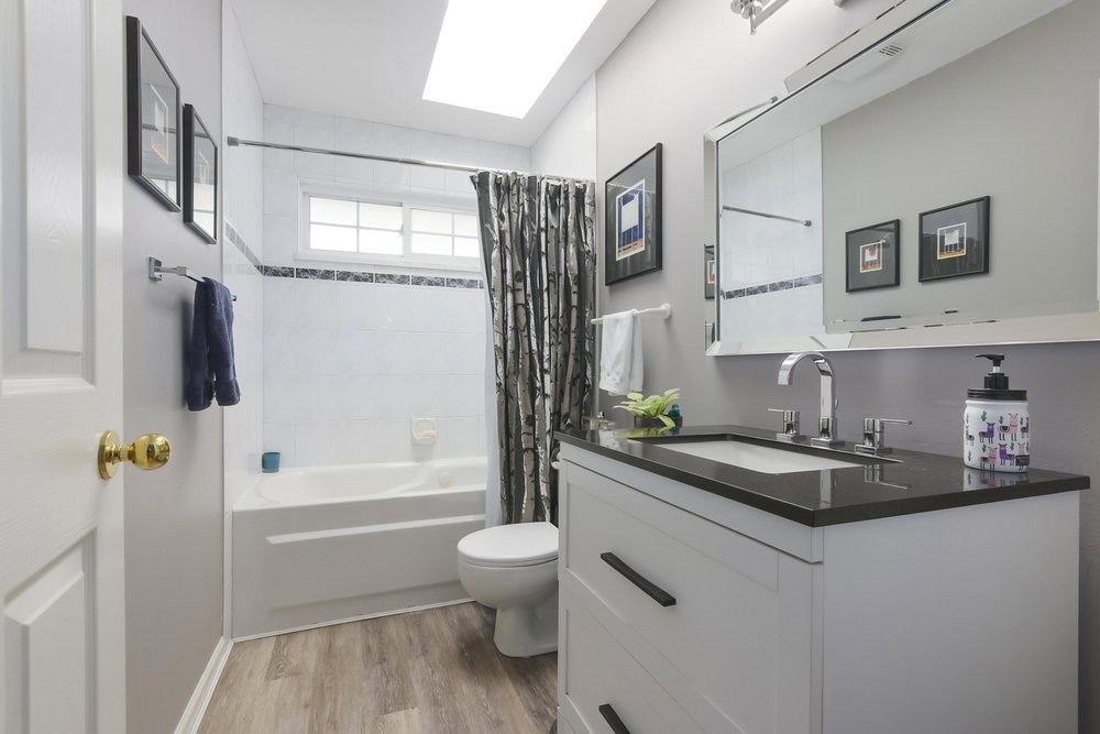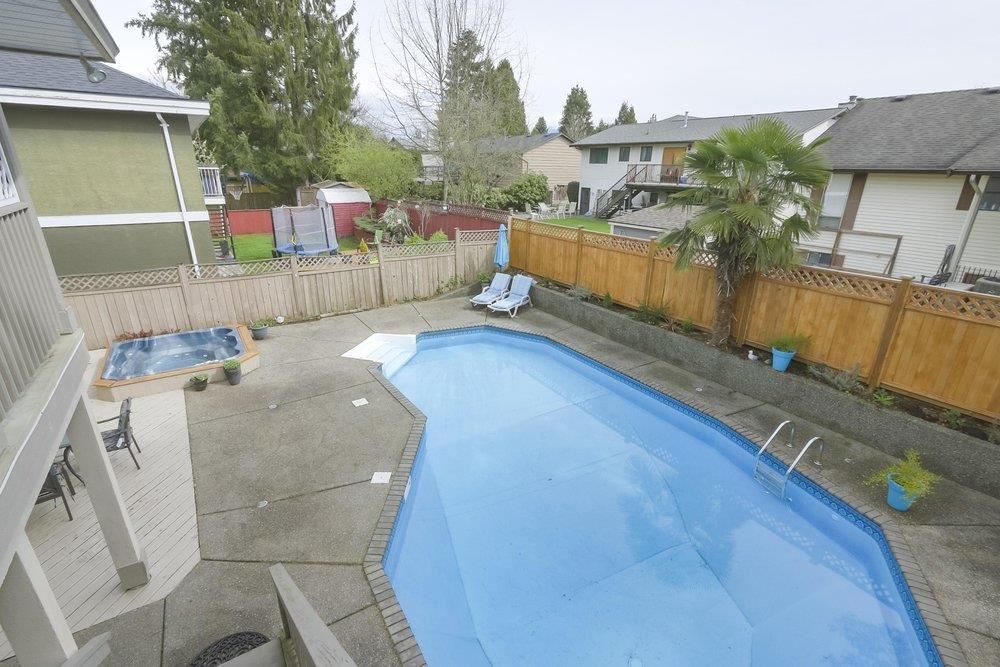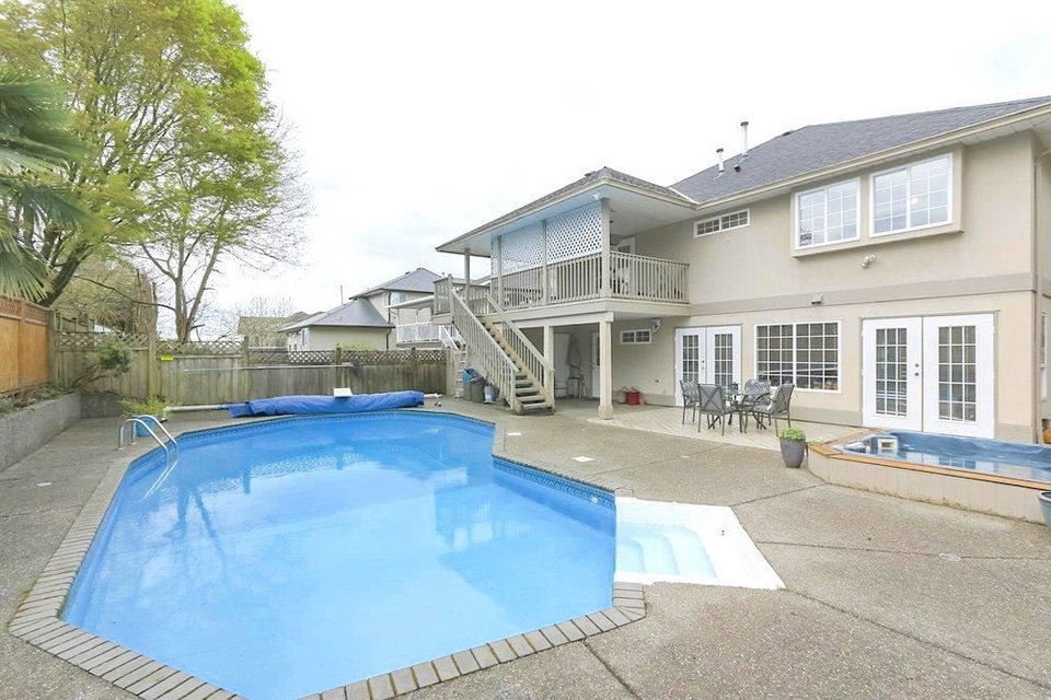 Spacious and unique floor plan – brightly lit with 4 bedrooms and a large den (which can easily be converted into a 5th bedroom or office space!) Legal suite with a separate entrance. Perfect home for a large or growing family, with 2 kitchens, 2 living rooms, 2 family rooms, 4 skylights, 3 gas fireplaces, an in-ground pool, hot tub, and decks off the front & back of the house. New roof (2017) and many other recent updates. Situated on ultra-convenient Harris Road.