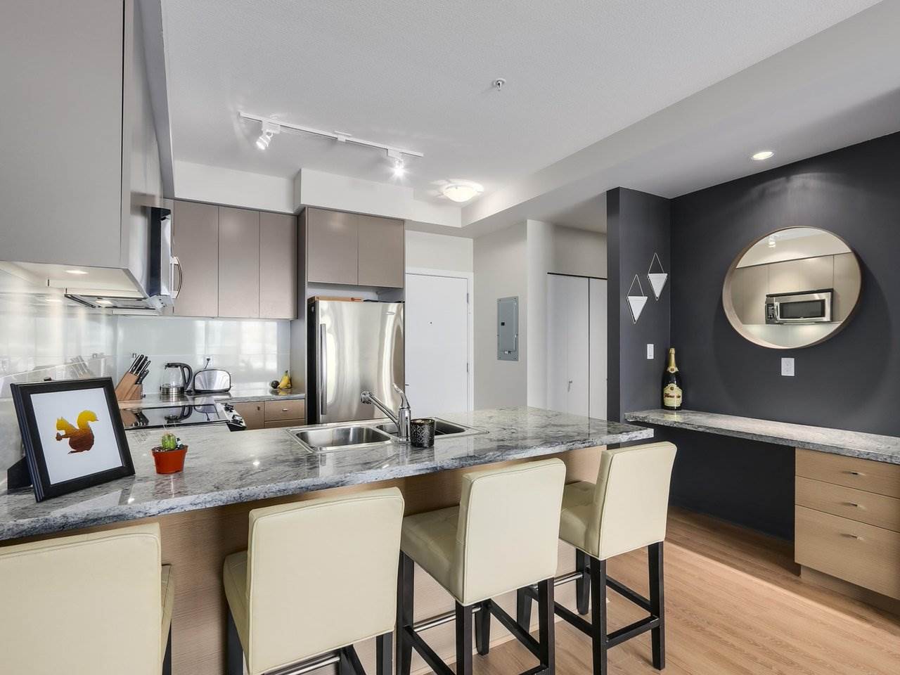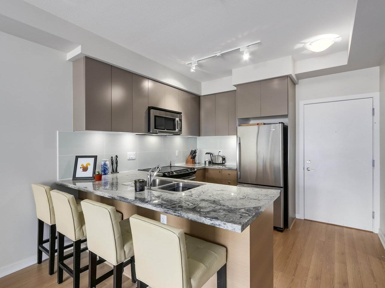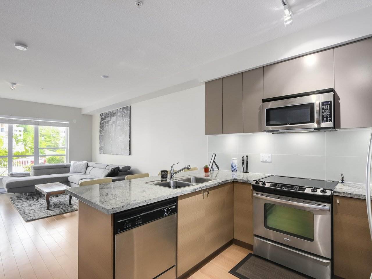 Welcome to Waterstone! This 1 bed and 1 bathroom comes with 9 FT high ceilings, granite kitchen & open concept. Covered patio with access off the living room. Master bedroom facing greenery & bridge. Raised ground floor unit for added security. Luxury ensuite with granite counters and soaker tub. The amenities include an amazing Wellness Clubhouse which includes 60′ pool, sauna, gym, steam room, billiards lounge, movie theatre, conference Room w/computer workstations fireside lounge and guest suites. Excellent location close to all major routes – transit, Willowbrook mall, etc.