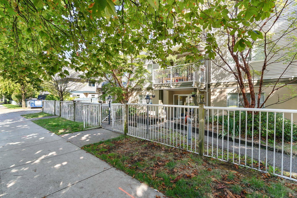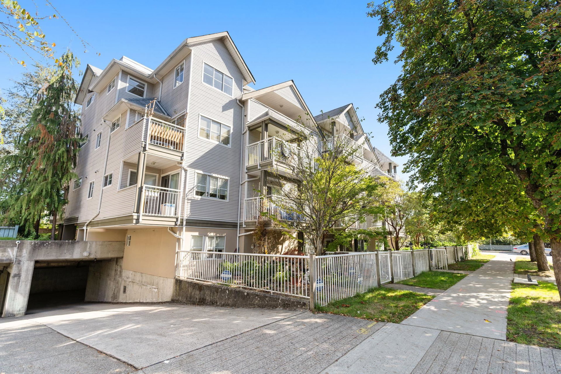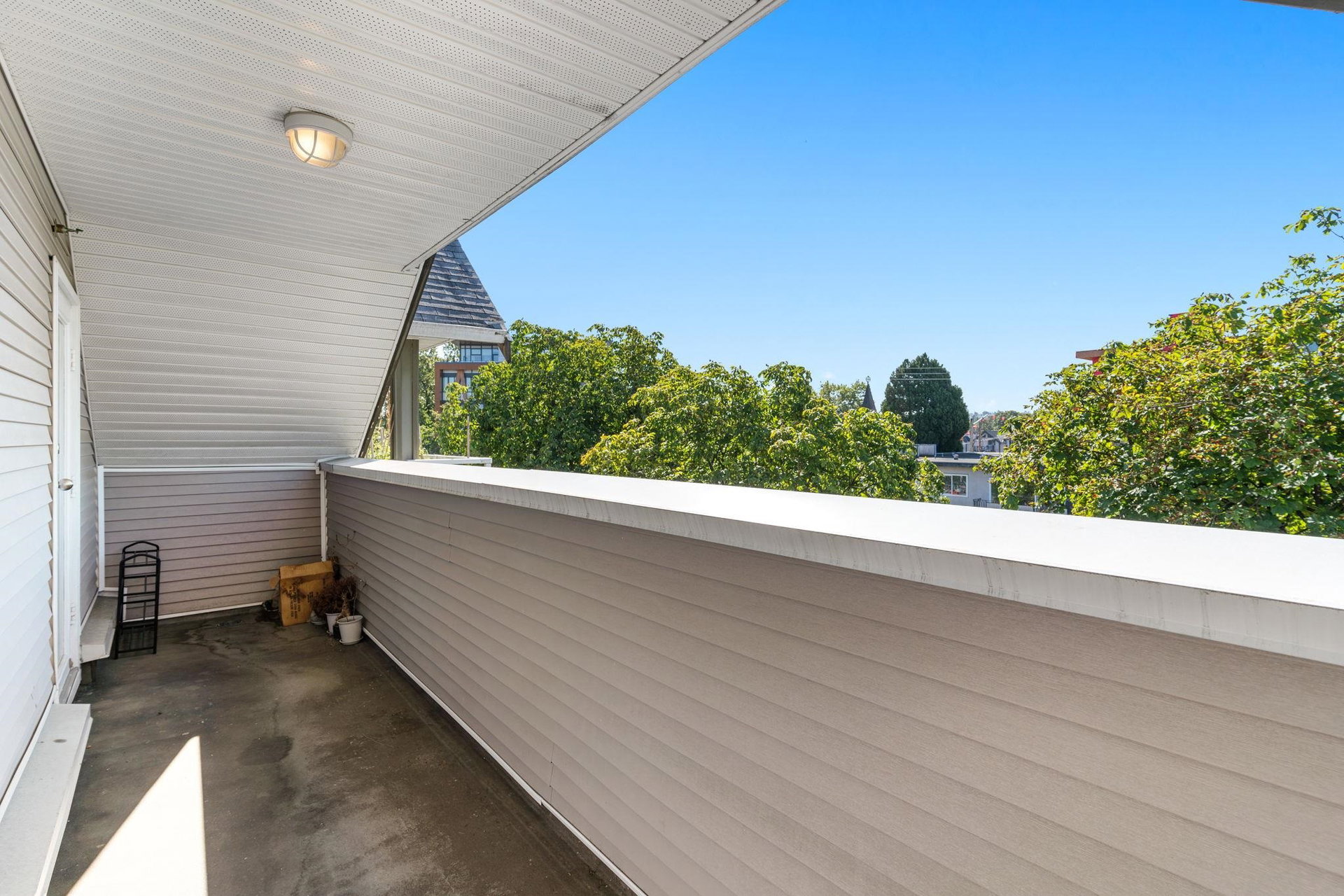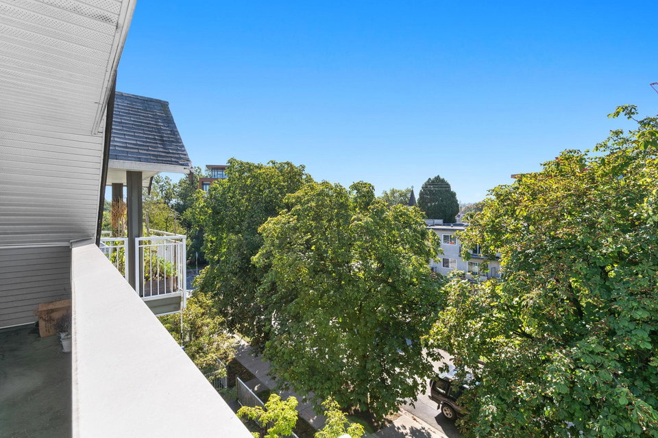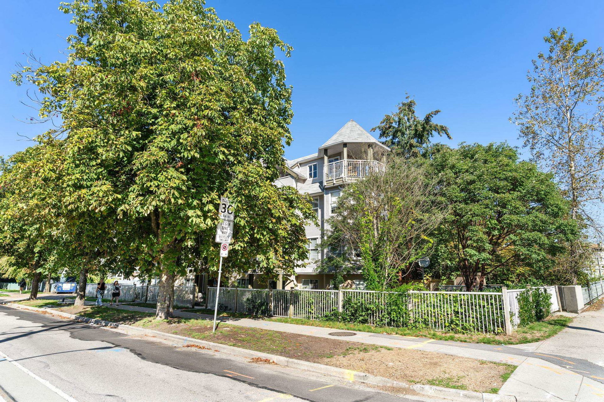 Presenting the Royal Victoria, an exceptional residence just steps from Commercial Drive. Ideally located one block from the SkyTrain and within walking distance to grocery stores, shopping, and coffee shops, this top-floor corner unit offers unparalleled convenience. Thoughtfully updated, the home features new paint, stainless steel appliances, sleek white cabinetry, custom reclaimed wood shelving, engineered hardwood, modern lighting, in-suite laundry, and a spacious covered balcony with captivating views. The well-maintained complex comprises only 14 units. The 767 sq/ft layout includes an open-concept kitchen, dining, and living area, one bedroom, a den (can be used as a second bedroom), and a full bathroom. Pets and rentals permitted!