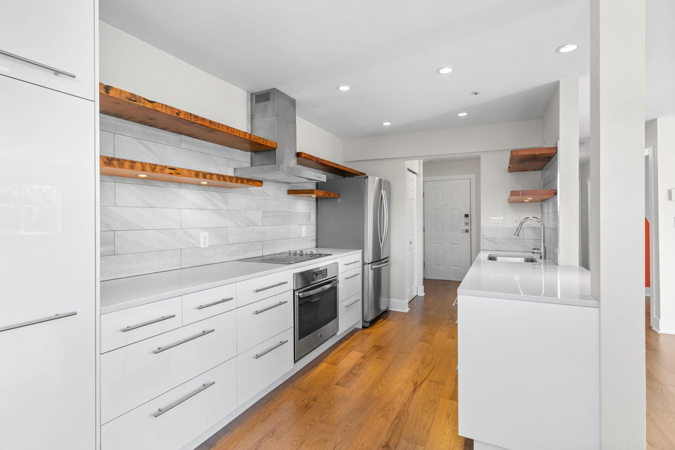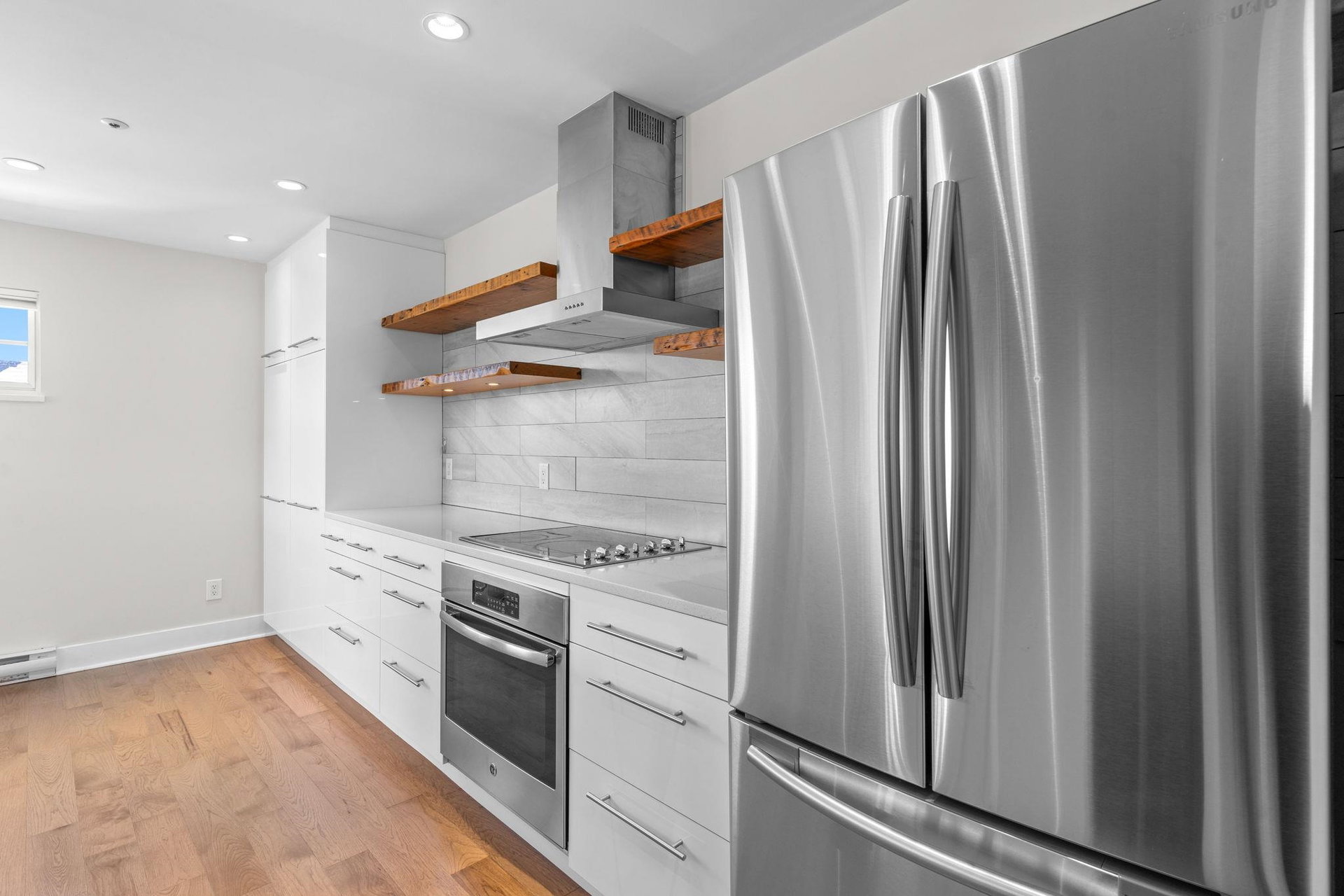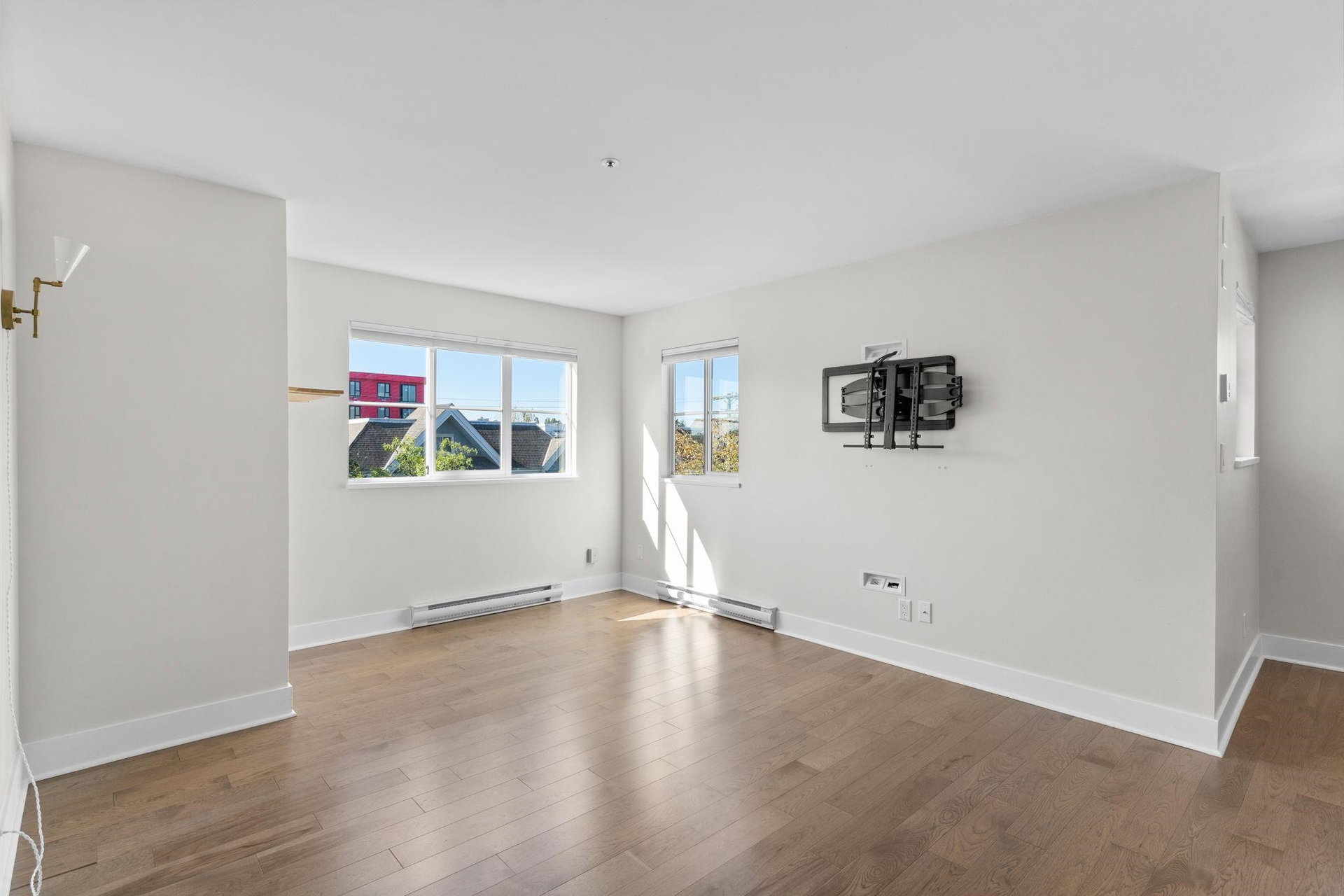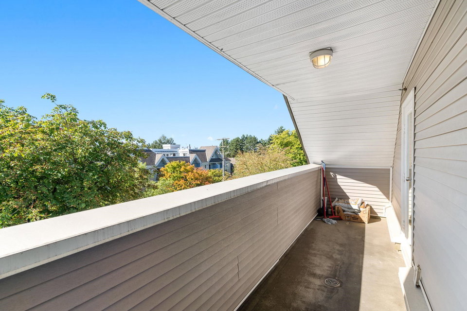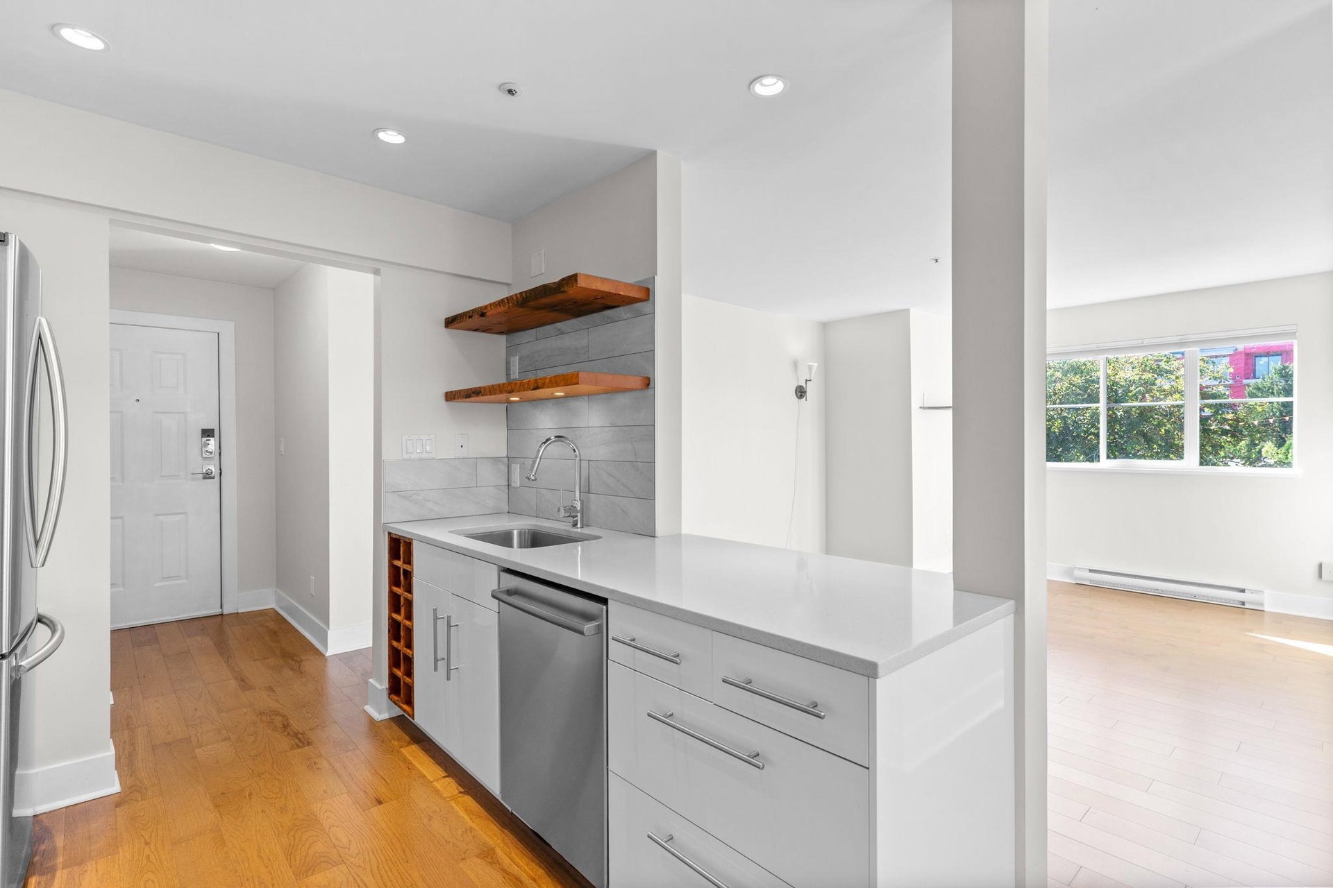 Presenting the Royal Victoria, an exceptional residence just steps from Commercial Drive. Ideally located one block from the SkyTrain and within walking distance to grocery stores, shopping, and coffee shops, this top-floor corner unit offers unparalleled convenience. Thoughtfully updated, the home features new paint, stainless steel appliances, sleek white cabinetry, custom reclaimed wood shelving, engineered hardwood, modern lighting, in-suite laundry, and a spacious covered balcony with captivating views. The well-maintained complex comprises only 14 units. The 767 sq/ft layout includes an open-concept kitchen, dining, and living area, one bedroom, a den (can be used as a second bedroom), and a full bathroom. Pets and rentals permitted!