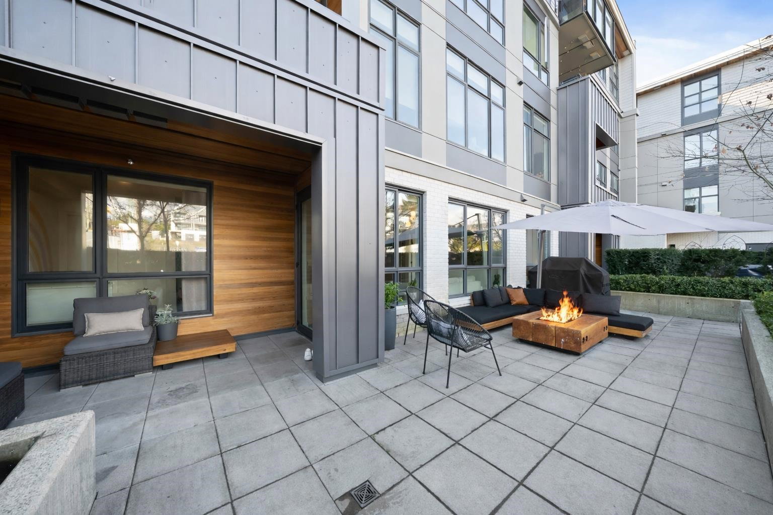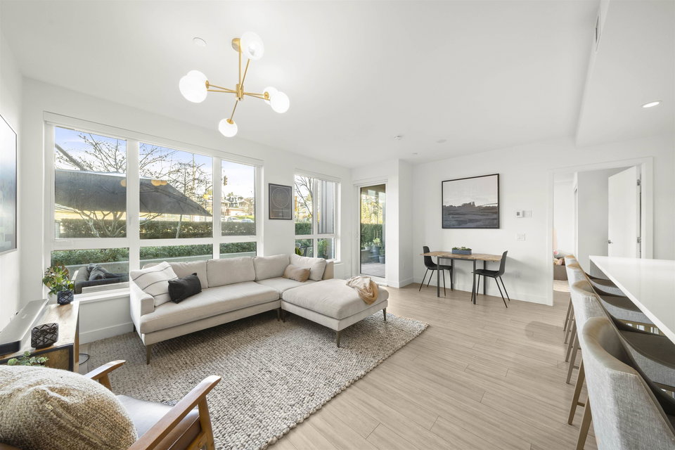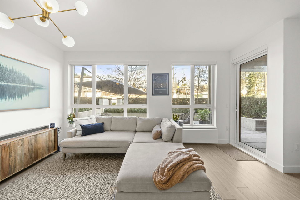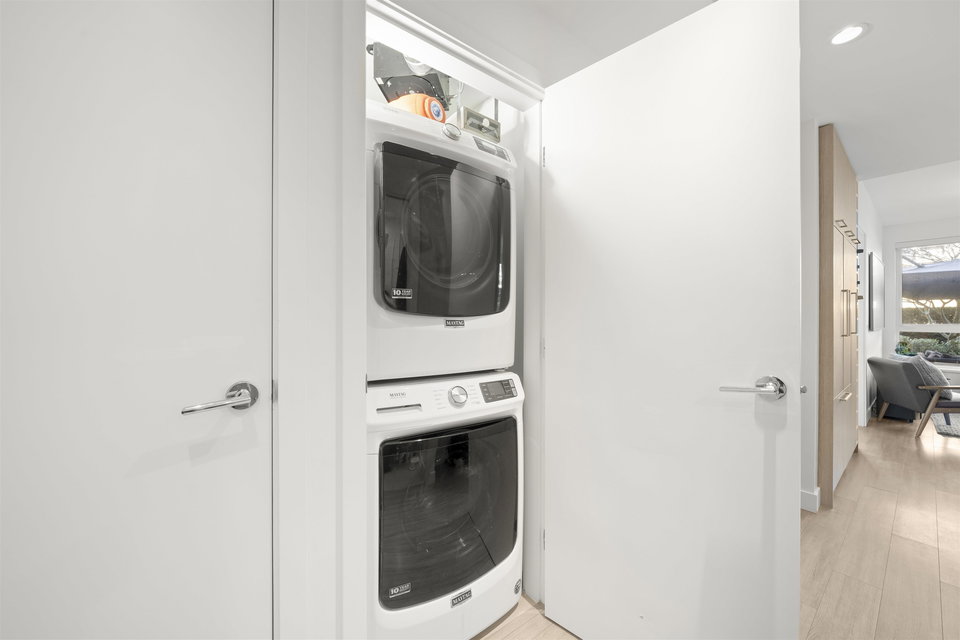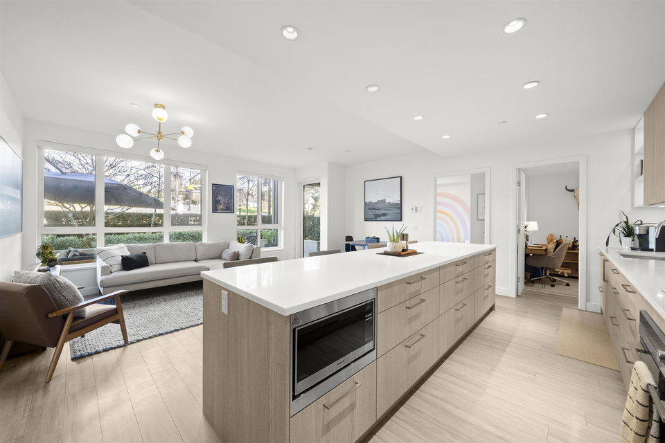 Rarely available ground-level 2 Bed + Den offering over 1,000 sq ft of interior living plus an impressive ~500 sq ft private patio in the LEED Platinum-certified building. Thoughtfully designed with a spacious, functional open layout anchored by a stunning oversized island that seamlessly connects the kitchen and living area—perfect for everyday living and entertaining. Enjoy walk-out access to an impressive oversized north-facing patio, ideal for pets, kids, or relaxing outdoors. Showroom condition with a high-end integrated kitchen, premium cabinetry and A/C for year-round comfort. Amenities include a fitness centre, lounge, guest suite and EV charging. Steps to Moodyville Park and the Spirit Trail, and just minutes to vibrant Lower Lonsdale. Pet friendly with 2 parking stalls included.
