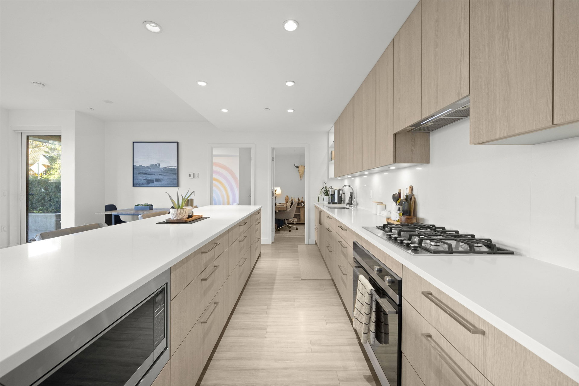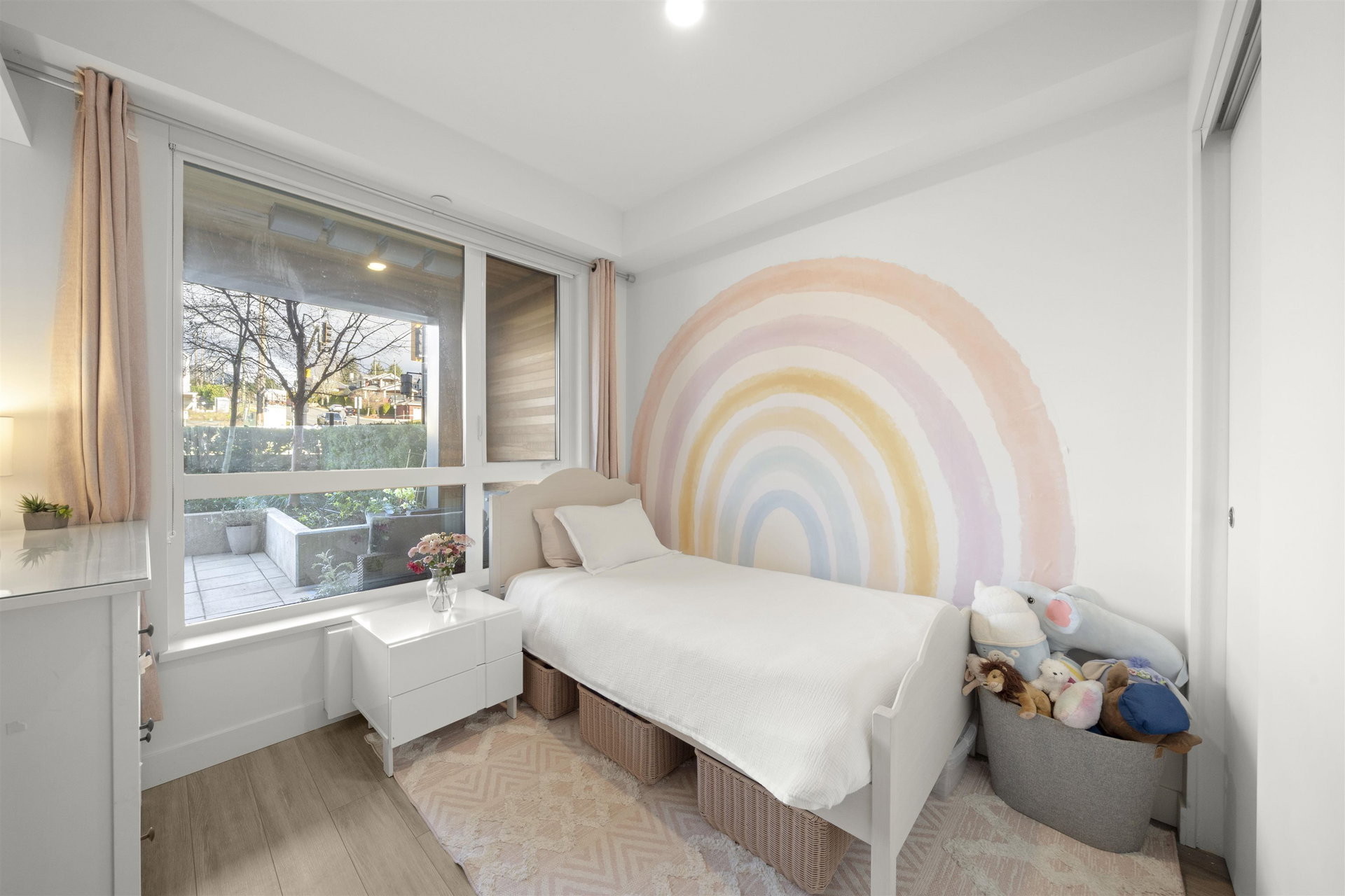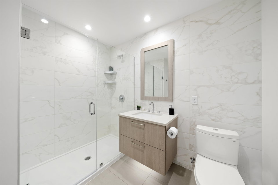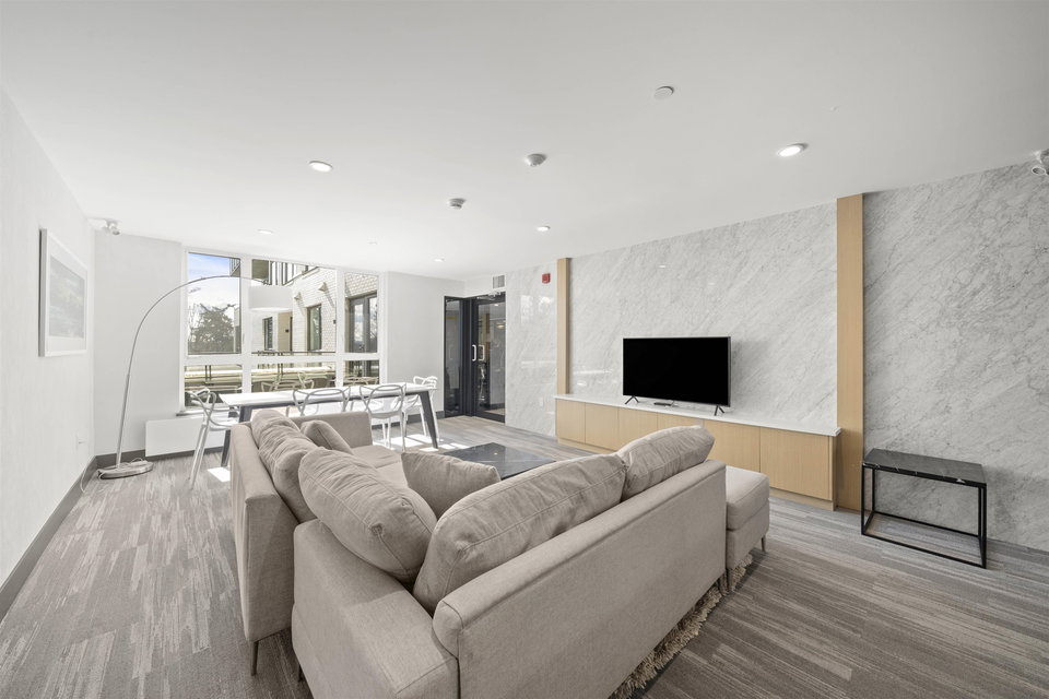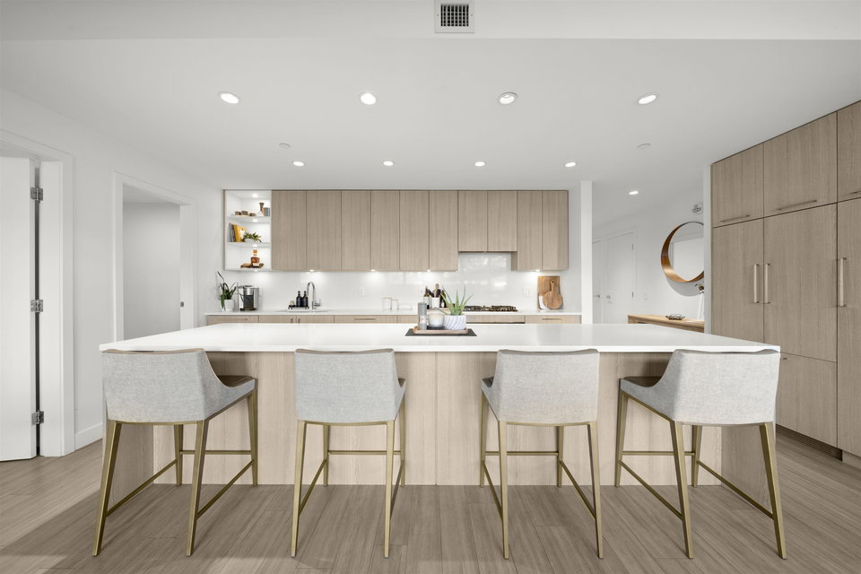 Rarely available ground-level 2 Bed + Den offering over 1,000 sq ft of interior living plus an impressive ~500 sq ft private patio in the LEED Platinum-certified building. Thoughtfully designed with a spacious, functional open layout anchored by a stunning oversized island that seamlessly connects the kitchen and living area—perfect for everyday living and entertaining. Enjoy walk-out access to an impressive oversized north-facing patio, ideal for pets, kids, or relaxing outdoors. Showroom condition with a high-end integrated kitchen, premium cabinetry and A/C for year-round comfort. Amenities include a fitness centre, lounge, guest suite and EV charging. Steps to Moodyville Park and the Spirit Trail, and just minutes to vibrant Lower Lonsdale. Pet friendly with 2 parking stalls included.